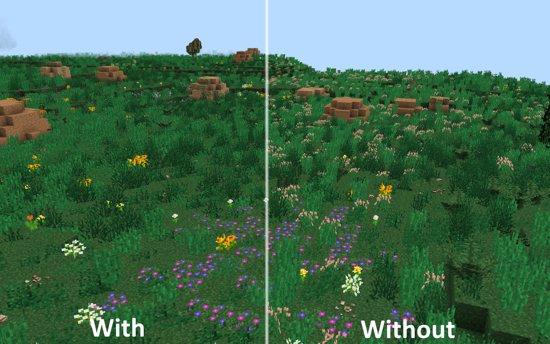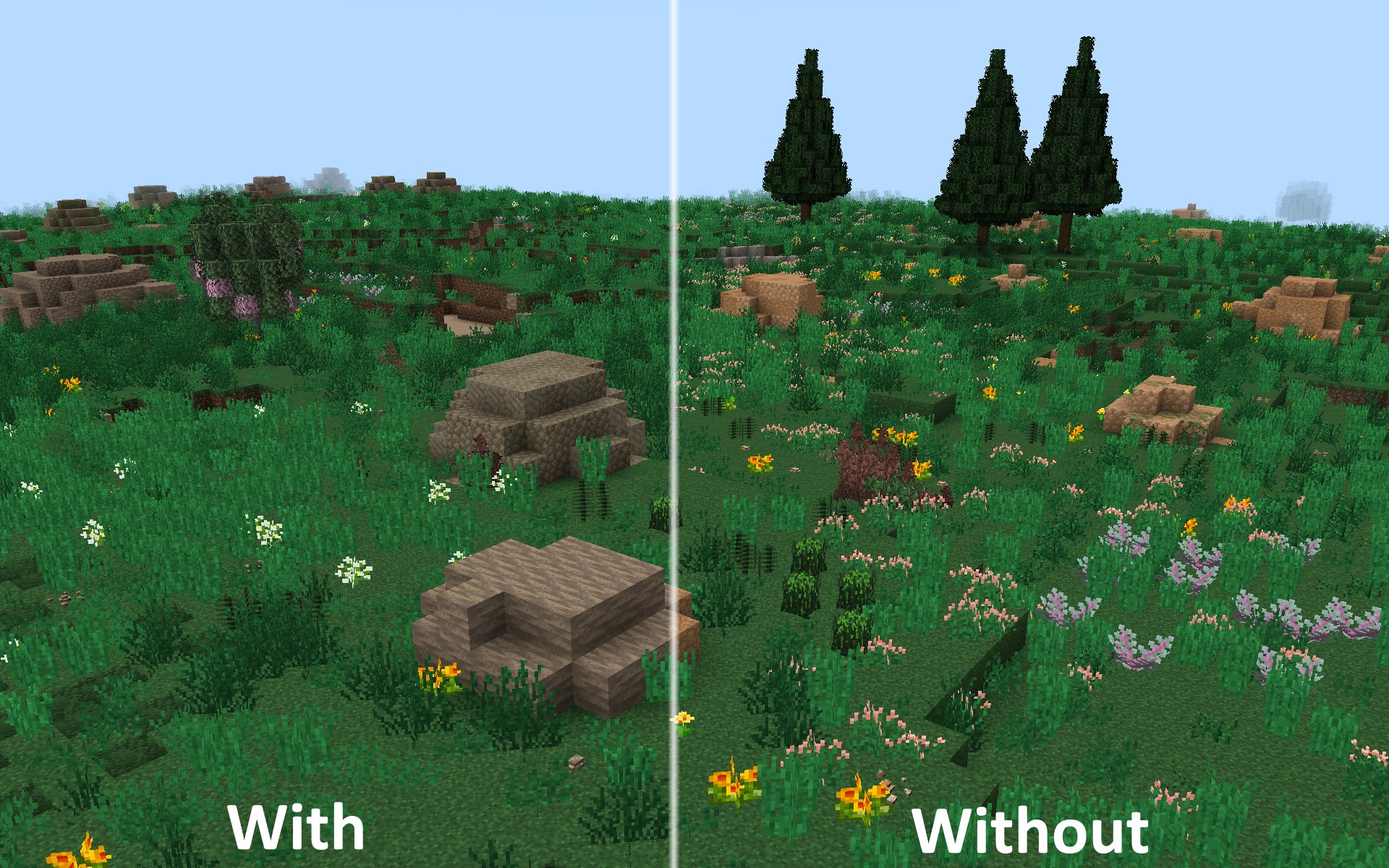 - Уменьшение растительного шума: Данная настройка убирает яркие бутоны у трех самых популярных типов трав: голубой травы, переключающейся травы и бромовой травы. Это позволяет растениям гармонично вписываться в окружающую среду, избавляя от визуального перегруза, который мог возникать в версии 1.18.
